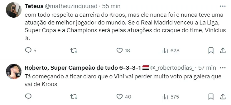 “Os favoritos à Bola de Ouro são Vinicius, Bellingham e Kroos. Eu adoraria que Toni Kroos ganhasse porque é meu amigo”, disse o croata, parceiro há muitos anos do alemão.