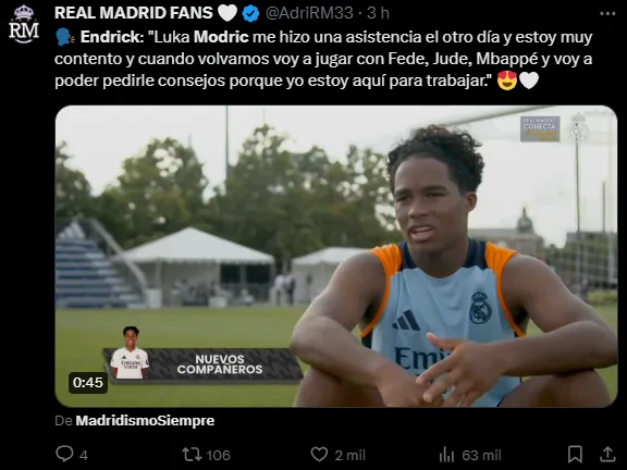 Ele completa: “Luka Modric me ajudou outro dia e estou muito feliz e quando voltarmos vou jogar com Fede, Jude, Mbappé e poderei pedir conselhos a ele porque estou aqui para trabalhar”, finalizou.