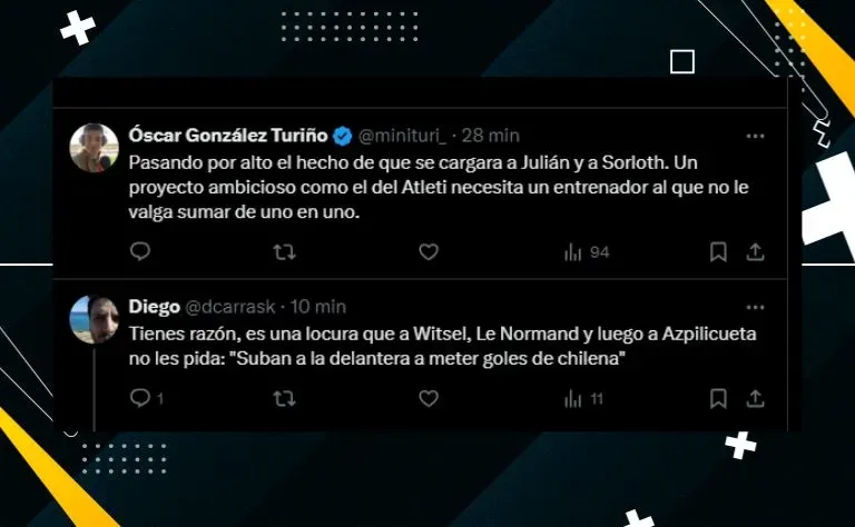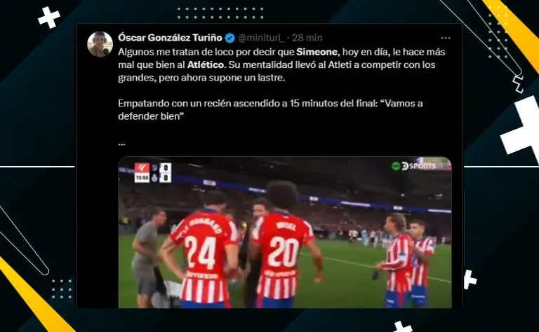 Matías Palacios comenta: “Ele não tem nenhum argumento para as substituições. Ele não tem coragem de jogar com Griezman, Julian e Sorloth. São sempre apenas dois dos três. E ainda troca um atacante (Sorloth) por um defensor (Reinildo), com o jogo 0 a 0″, disparou na TV Chiringuito.