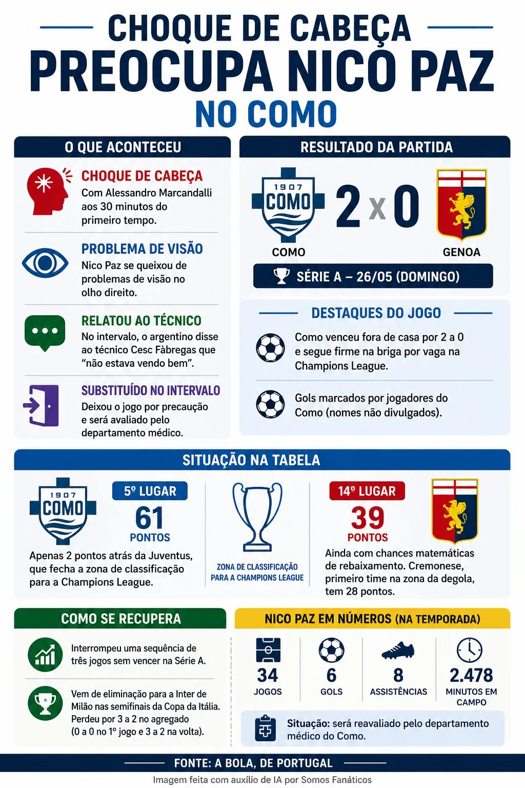 O Como venceu o Genoa por 2 a 0 neste domingo (26), pela Série A, mas a partida ficou marcada pela lesão de Nico Paz, que deixou o campo após um choque de cabeça e problema de visão.