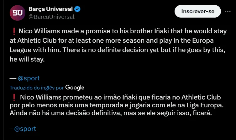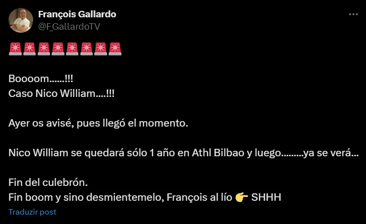 Outras fontes também garantem a permanência de Nico na cidade basca. Franços Gallardo é uma das fontes. “Ele ficará por mais uma no no Bilbao e depois… veremos”, publicou o periodista, no X.