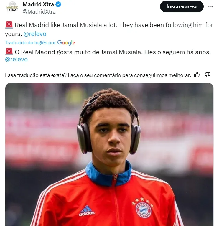 Segundo o jornal Relevo, o Real Madrid segue Musiala há anos e gosta muito do seu futebol. Não há informações sobre propostas ou contatos, mas o jovem é um sonho merengue e do presidente Florentino Pérez.