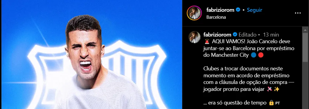 De acordo com as informações publicadas pelo renomado jornalista Fabrizio Romano, o Barcelona fechou a contratação do lateral João Cancelo, do Manchester City, da Inglaterra.