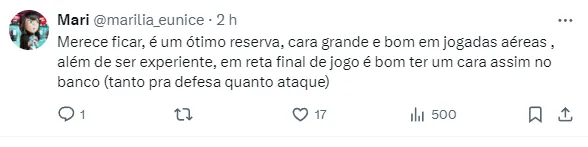 É bem verdade que o jogador já está com 34 anos de idade. Porém, como dito, não será titular absoluto e poderia ser uma opção a mais para jogos que exijam atletas de seu estilo.
