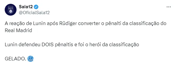 Lunin também saiu como herói. O goleiro defendeu duas cobranças e, após o chute decisivo de Rüdiger, ainda demonstrou uma grande tranquilidade com a classificação. Isso chamou a atenção.