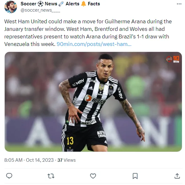 Com a janela de transferências de janeiro se aproximando, o clube inglês está de olho em reforços que possam tornar a equipe mais competitiva, e um dos nomes em pauta é o lateral-esquerdo Guilherme Arana, do Atlético-MG, de acordo com informações do site 90min.