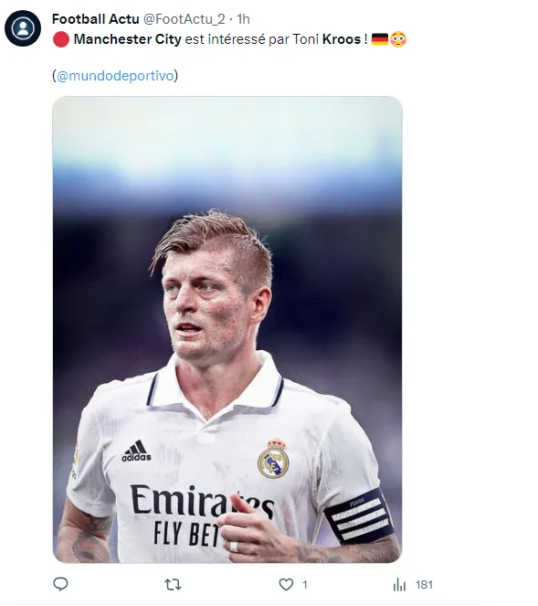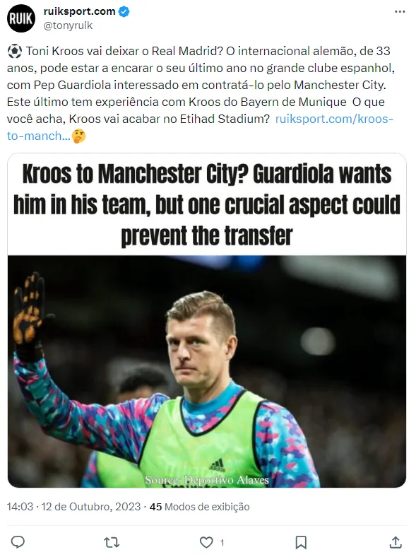 De acordo com informações do site The Gard Tackle, o Manchester City estaria disposto a fazer uma proposta de 30 milhões de euros a Toni Kroos para um contrato de dois anos, oferecendo um salário de 15 milhões de euros. Kroos, um jogador com um histórico de conquistas no Real Madrid, possui contrato com o clube espanhol até 2024.