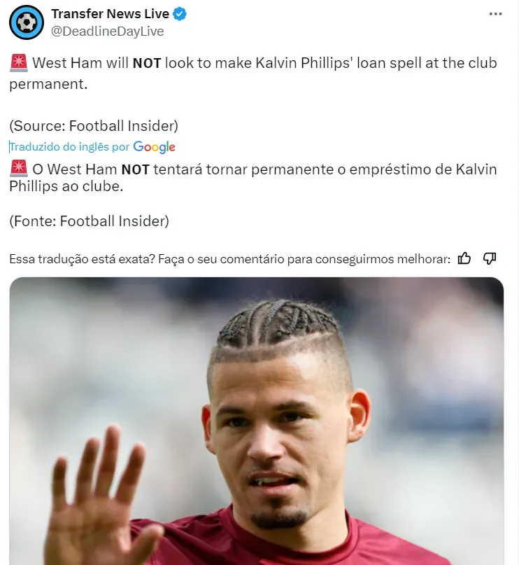 O volante Kalvin Phillips também está de saída do Manchester City. O inglês, que estava sem espaço com Guardiola, foi emprestado ao West Ham até o final da temporada e não deverá ficar no time azul de Manchester, que, no mercado, procura por oportunidades de negócio.