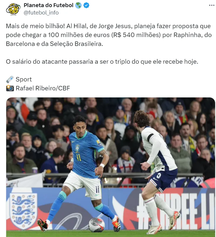 O destino pode ser a Premier League, onde há interessados, inclusive, com grande ofertas, ou o mundo saudita. O Barcelona espera arrecadar em torno de 100 milhões com a venda de Raphinha.