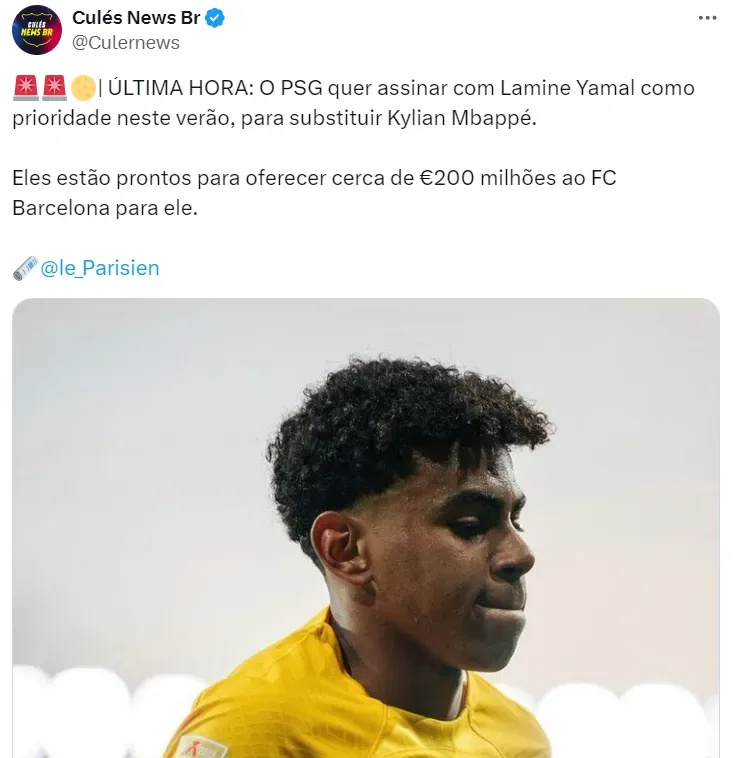 Em caso de um acordo por esse molde, Lamine Yamal se tornaria a segunda maior transferência de toda a história do futebol europeu, superando o mesmo Mbappé, que custou 180 mi de euros, e atrás de Neymar, também do PSG, que custou 222 milhões de euros.