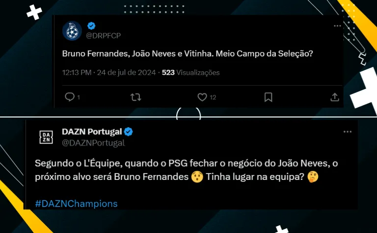 O PSG está interessado no futebol do português Bruno Fernandes para a nova temporada que já começou. O clube de Paris acertou a contratação de João Neves, também português, e deseja que seu meio-campo seja tomado por jogadores portugueses, visto que Vitinha é titular de Luis Enrique.