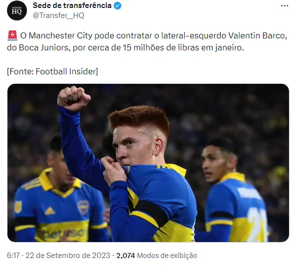 De acordo com informações do portal “Football Insider“, o Manchester City expressou seu interesse em Valentin Barco, jovem defensor de apenas 19 anos do Boca Juniors. O clube inglês estaria disposto a oferecer uma quantia significativa, estimada em 15 milhões de libras, na tentativa de garantir a contratação do talentoso lateral.