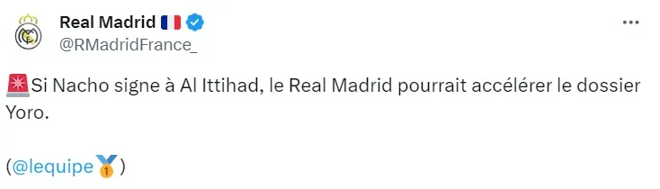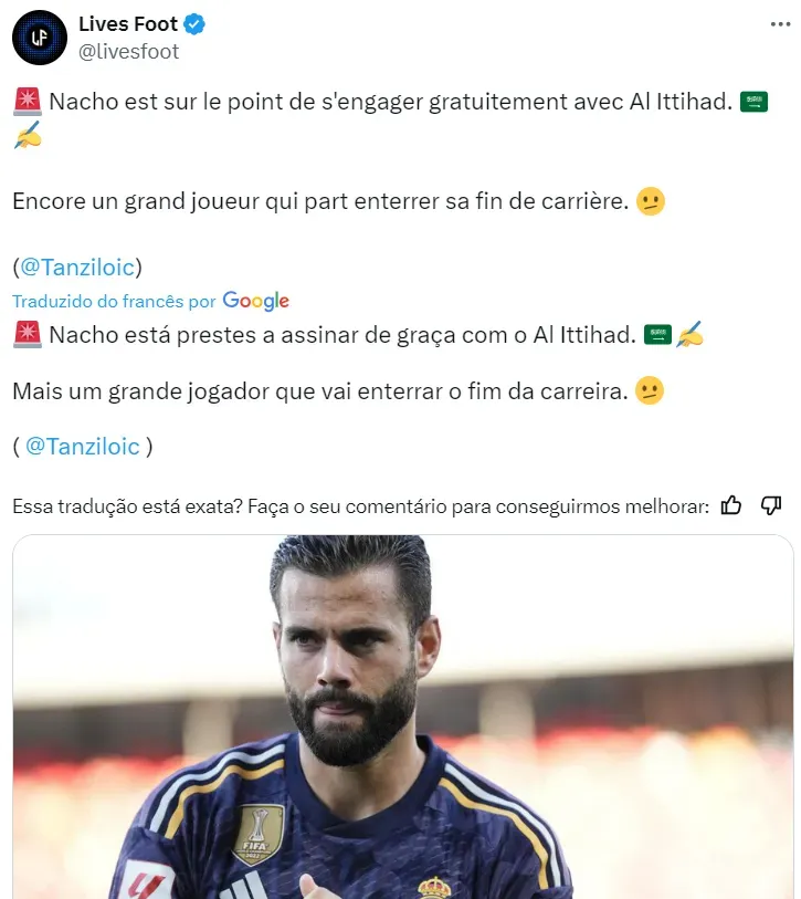 Nacho, em fim de contrato, será reforço do Al-Ittihad, confirma várias fontes da imprensa internacional. Carlo Ancelotti gostaria de contar com o defensor e lamenta a saída. No mercado, o Real Madrid já tem em mente o substituto.
