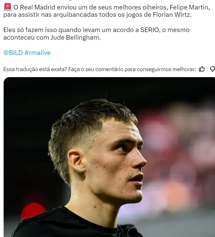 O clube merengue enviou o olheiro Felipe Martin, um dos seus melhores homens, para assistir de perto Wirtz em vários jogos com a camisa do Leverkusen. O Real Madrid só envia olheiros quando o interesse é iminente.