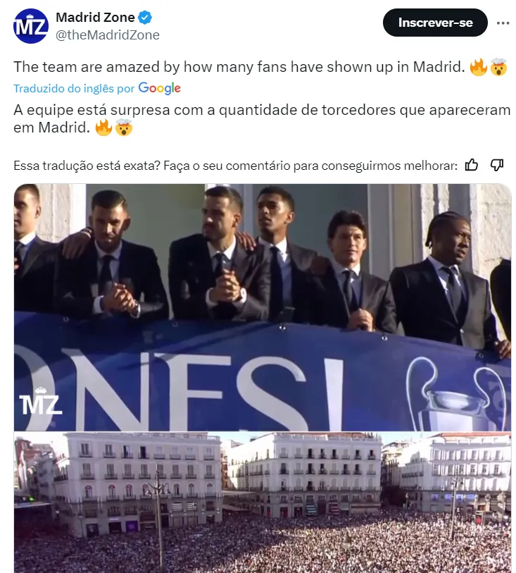 Nas ruas de Madri, todos os jogadores comemoram sob a presença de milhares torcedores merengues, que cantam que Vinicius Jr merece conquistar a Bola de Ouro da temporada.