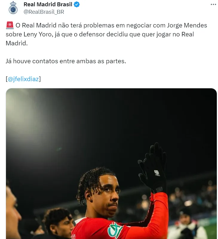 O clube merengue agora vai negociar com o agente de Yoro, Jorge Mendes, e também com o time atual do defensor, o Lille. Segundo infomações de José Félix Diaz, a diretoria de Madrid não terá problemas para negoicar com o agente do atleta.