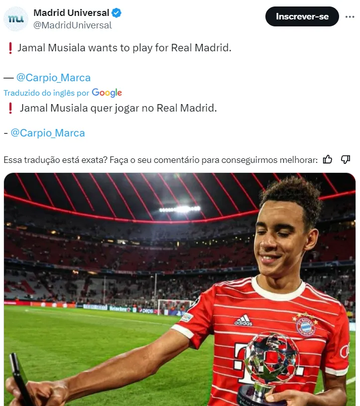 Musiala, do Bayern de Munique, também deseja jogar na Espanha e teria se oferecido ao Real Madrid como uma oportunidade e única de negócio no mercado. A informação é passada por Carlos Carpio, periodista da Rádio Marca, da Espanha.