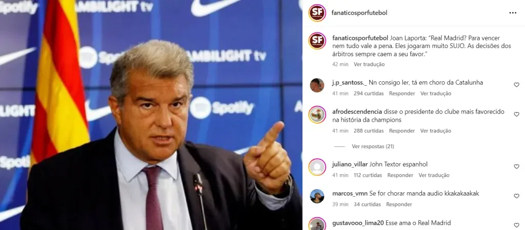 Laporta também frisou que o Real Madrid faz de tudo para vencer e isso acabando fazendo com que a equipe jogue sujo. “Para vencer, nem tudo vale a pena, jogou muito sujo. As decisões dos árbitros sempre caem a seu favor”, disse. A declaração pode ter relação com o último jogo frente as equipes, em LaLiga.