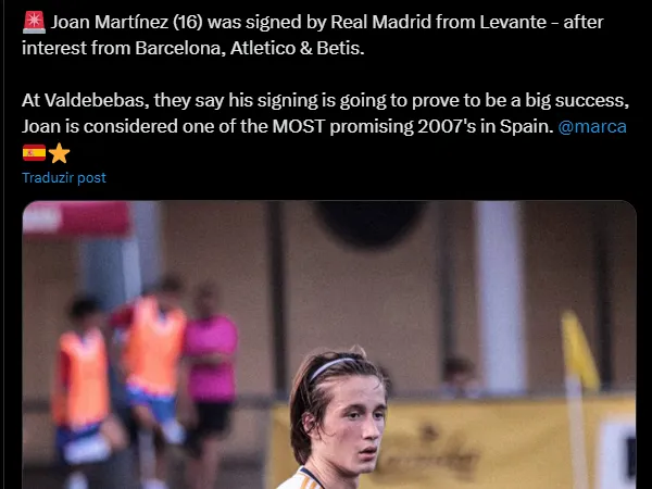 Joan Martínez é o nome da joia. O Real Madrid conseguiu contratar o jovem na frente do arquirrival Barcelona, além de ter deixado Atlético de Madrid e Betis para trás no negócio.