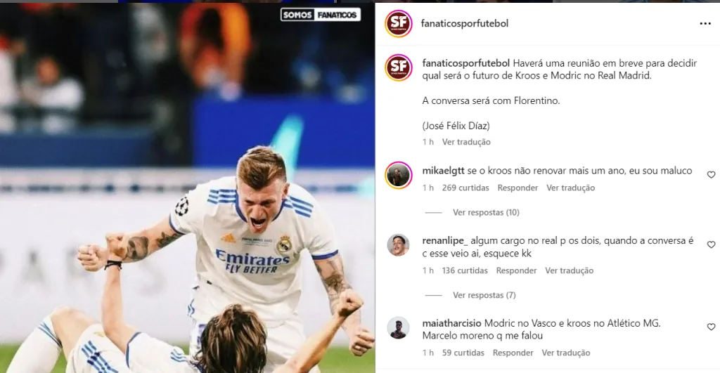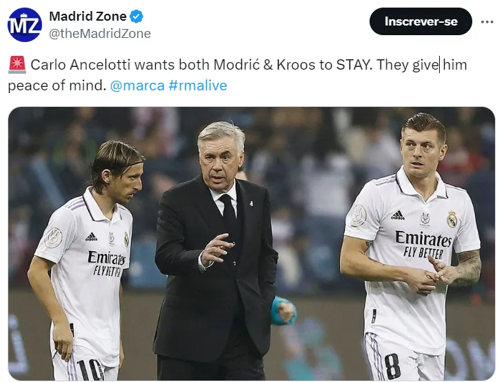 Carlo Ancelotti deseja contar com os serviços de Kroos e Modric no comando do Real Madrid para a próxima temporada. Os dois jogadores, ídolos históricos, têm seus vínculos ligados ao clube merengue válido até julho de 2024.