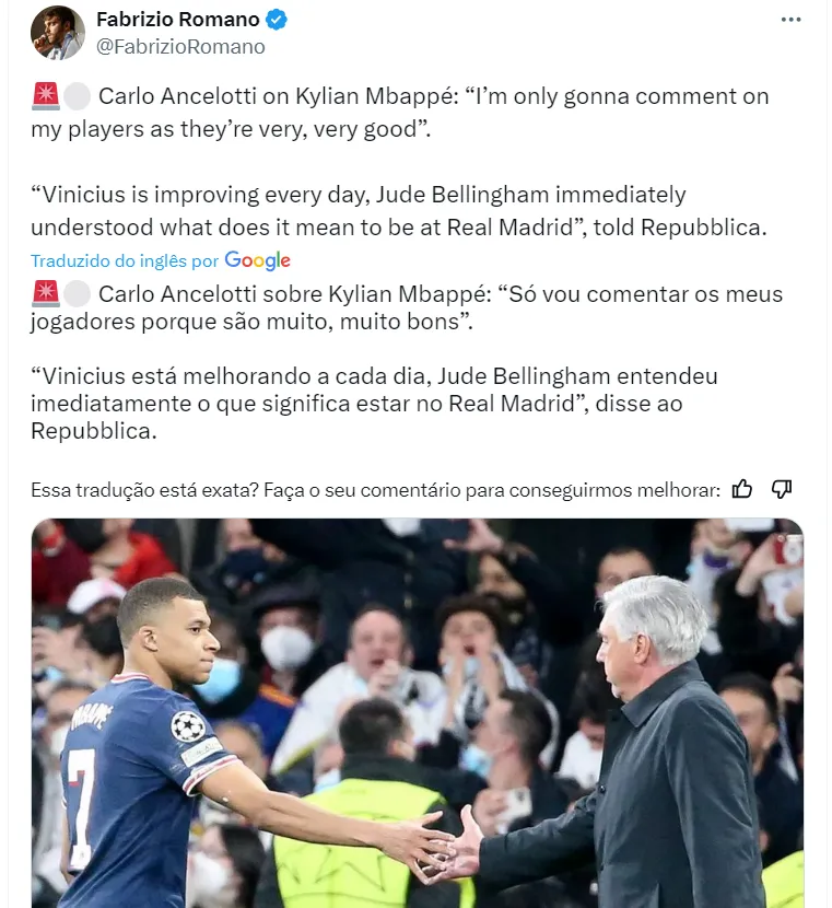 A decisão de Mbappé em vestir a camisa 9 e também atuar como atacante fixo tem relação com Vini Jr, que veste a camisa 7 e ocupa o lado esquerdo do time de Ancelotti.