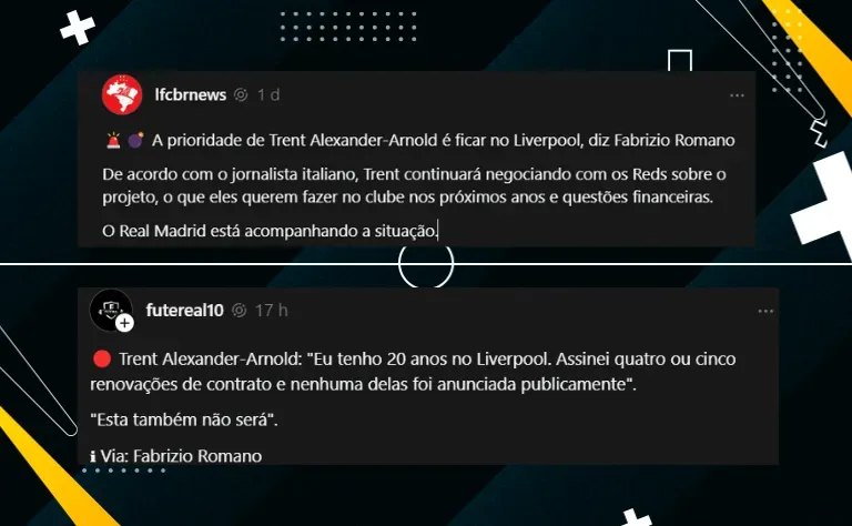 Arnold e Liverpool negociam um novo acordo milionário. Além da questão salarial, o projeto vem sendo levado em conta. O entendimento é que Trent deseja ter certeza que renovará com um time que brigará por todos os títulos, uma vez que o Real Madrid sempre está entre os favoritos as conquistas.