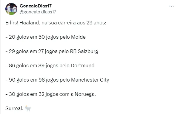 Enquanto isso, Haaland segue na equipe comandada por Pep Guardiola. Somando as duas temporadas no time, já são incríveis 90 gols em apenas 98 partidas.