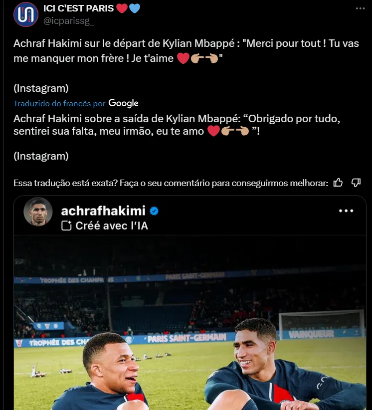 Segundo informações do portal internacional Defensa Central, voltado ao clube merengue, em um papo com Florentino Pérez, Mbappé deixou escapar que gostaria de jogar com Hakimi na Espanha.
