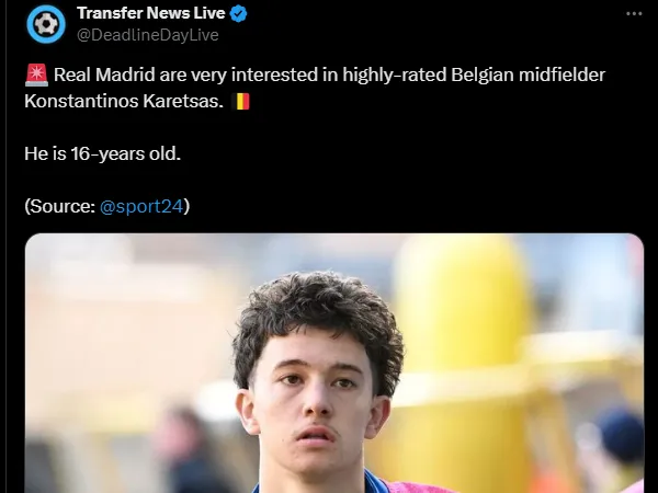 Carlo Ancelotti faz parte desse planejamento e dá aval para que o time espanhol busque Konstantinos Karetsas, de apenas 16 anos de idade e com contrato no KRC Genk.
