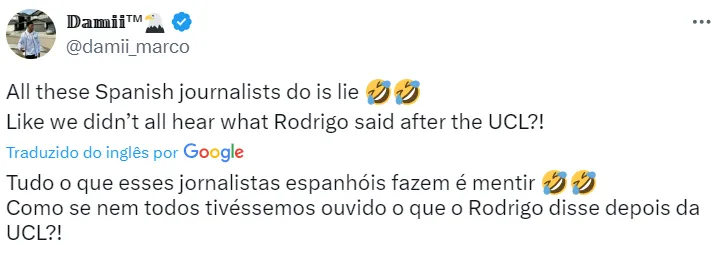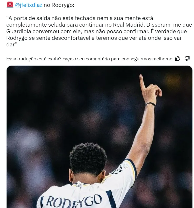 “A porta de saída não está fechada e nem a sua mente está selada para seguir em Madrid. Me disseram que Guardiola conversou com ele, mas não posso confirmar. A verdade é que Rodrygo se sente desconfortável e teremos que ver até onde isso vai dar”, disse José Félix.
