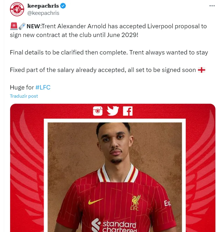O perfil Keepachris, voltado ao time de Liverpool, conta que Arnold está em negociações em andamento para renovar seu contrato com o Liverpool até 2029. A fonte informa que o inglês já aceitou a oferta dos Reds.