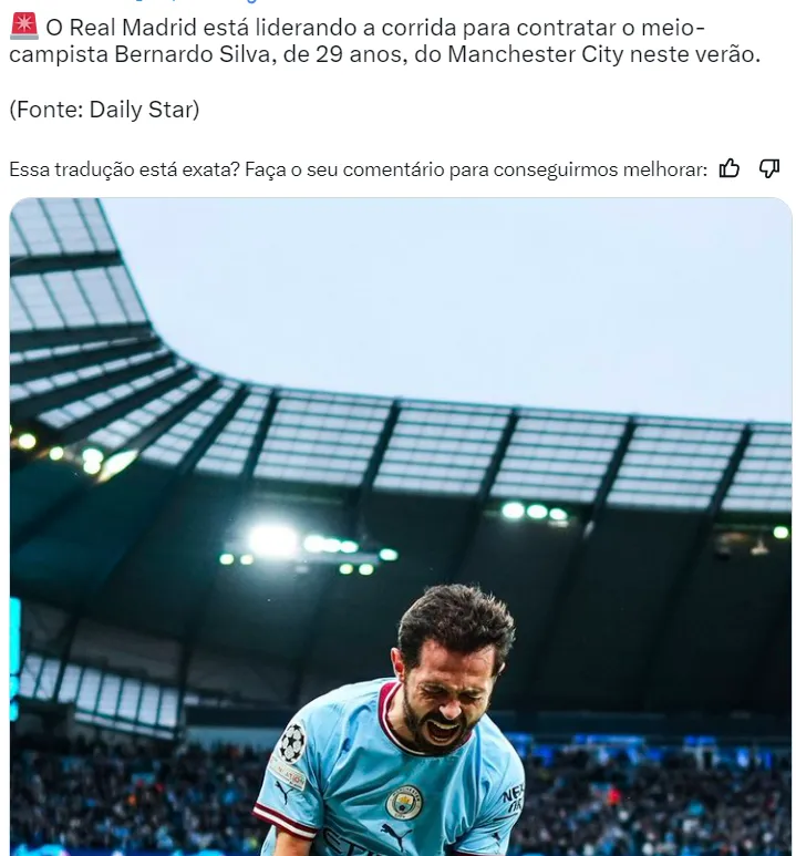 Segundo informações do jornal Daily Star, o clube merengue lidera a corrida para ter Bernardo Silva, do Manchester City, na próxima temporada, em meio à informação de que o meia estaria deixando o City – avança à rádio Catalunha.