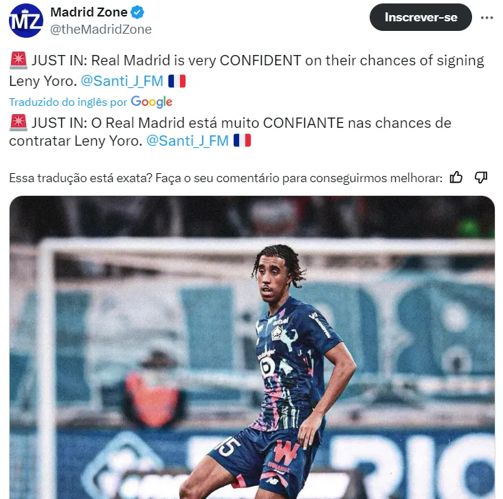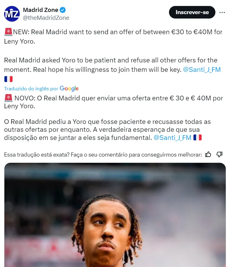 Leny Yoro também deverá ser reforço merengue por um valor entre 30 a 40 milhões de euros. Os espanhóis haviam dado um passo atrás pelo jovem, mas as atenções voltaram e um acordo se encaminhou nas últimas horas, segundo informações de Santi Aouna, jornalista do Foot Mercato.