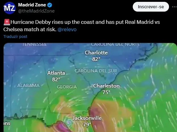 A informação é que o furacão Debby sobe pela costa e coloca em alerta o confronto entre ingleses e espanhóis, amanhã. Caso isso ocorra, a próxima partida do Real Madrid será apenas a Supercopa da UEFA.