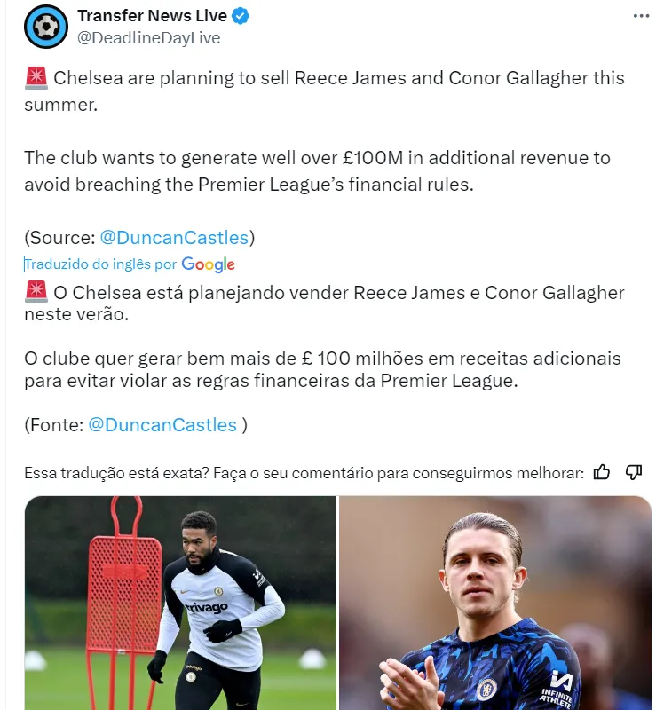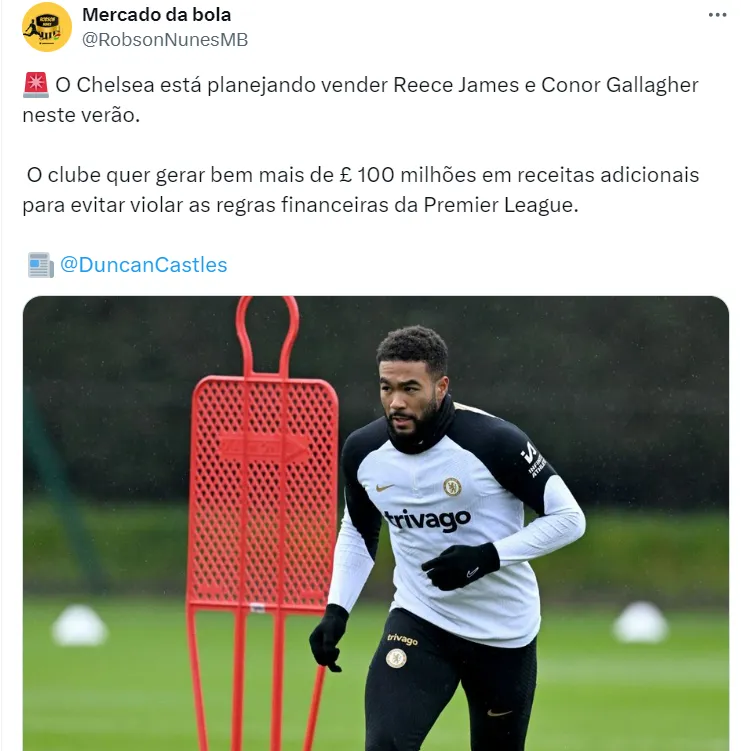 Reece James é o atual capitão do Chelsea, mas não consegue jogar um grande futebol devido as constantes lesões. O Chelsea entende que precisa gerar 100 milhões de euros com vendas. Gallagher também pode deixar o clube.
