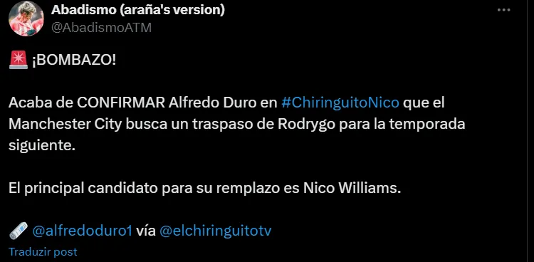 Com a chance de perdê-lo, o Real Madrid teria definido o espanhol Nico Williams como prioridade no mercado. O jovem, alvo do Barcelona, seria a preferência espanhola caso a revelação santista mude de ideia e aceite viver um novo desafio na Premier League. A informação foi passada por Alfredo Duro, do Chiringuito.