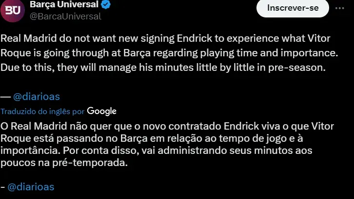 O Real Madrid não quer de maneira alguma que o novo contratado, Endrick, que revelou oferta para ir para o Barcelona, viva o que Vitor Roque está vivendo do outro lado da Espanha em relação a tempo de jogo e fama dentro do time.
