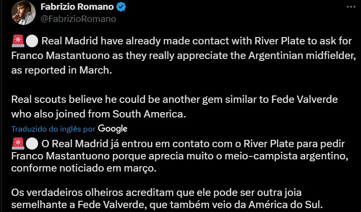Esse mesmo método será usado pelo Real Madrid em busca de se aproximar de vez pela contratação da jovem promessa argentina Franco Mastantuono, de 16 anos de idade, do River Plate, segundo informações do PlanetaRealMadrid e outras fontes da Espanha, como o jornal Relevo.