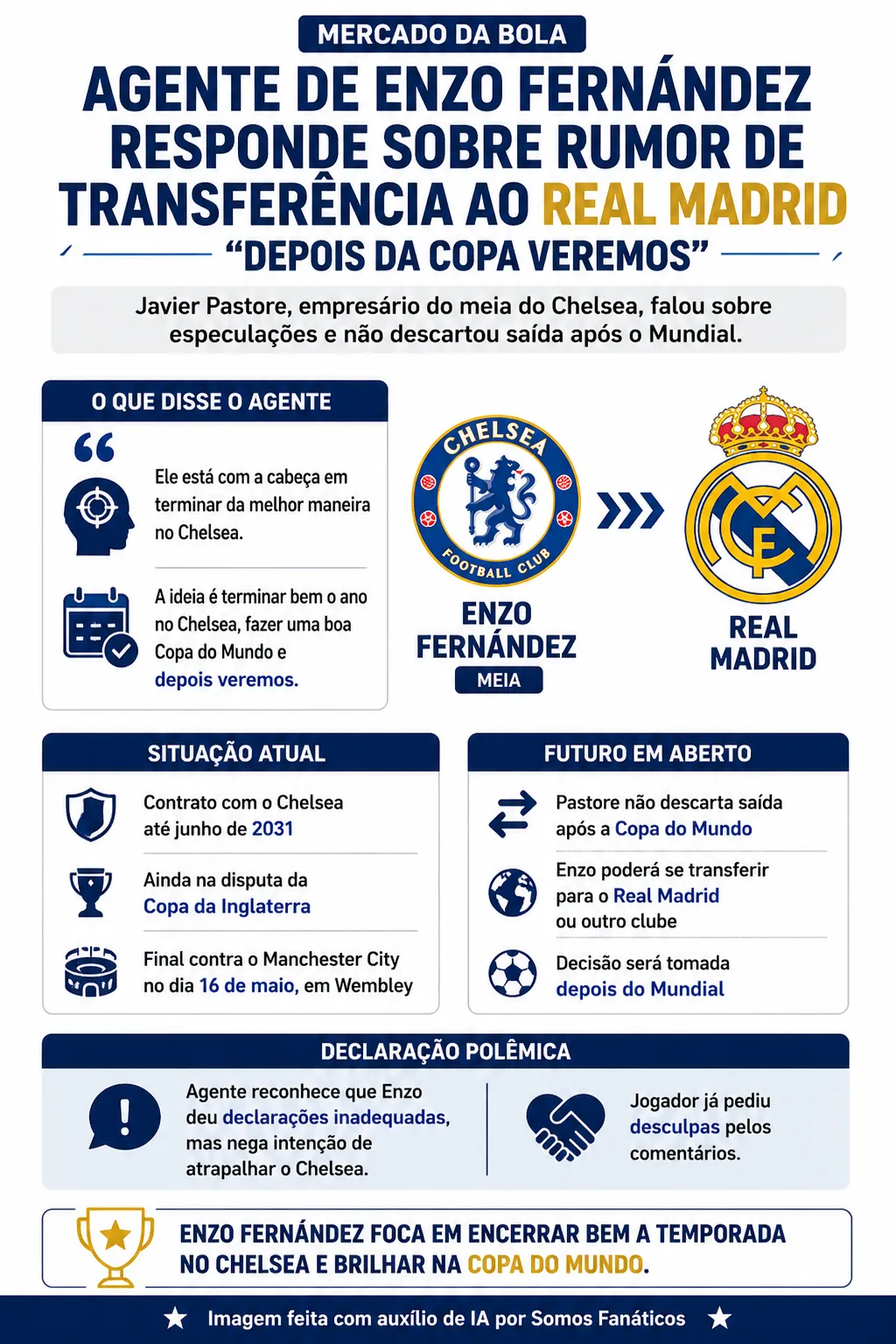 A permanência de Enzo Fernández no Chelsea está garantida até o fim desta temporada. Questionado sobre a especulação de ida ao Real Madrid, Javier Pastore, agente do atleta, negou, mas deixou as portas abertas para a saída após a Copa do Mundo.