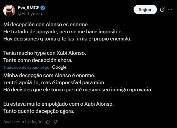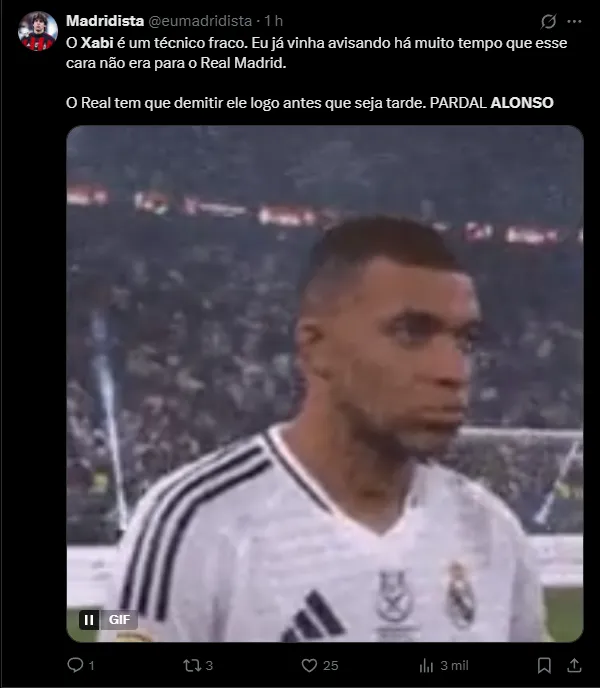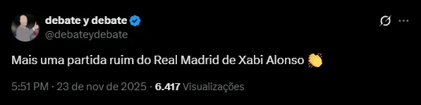 Nas redes sociais, a torcida do Real Madrid atribuiu a partida ruim da equipe diante do Elche ao treinador Xabi Alonso. O time não apresentou uma boa partida e agora tem a liderança ameaçada na disputa da La Liga.