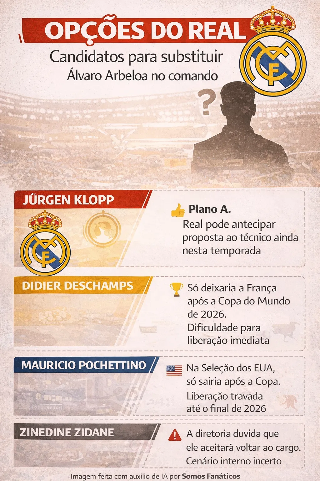 Klopp não é o único treinador na mira do Real Madrid, que não manterá Arbeloa. O clube também aprecia Didier Deschamps, mas esbarra na Copa do Mundo. O técnico deixará a Seleção Francesa somente após o fim do torneio.