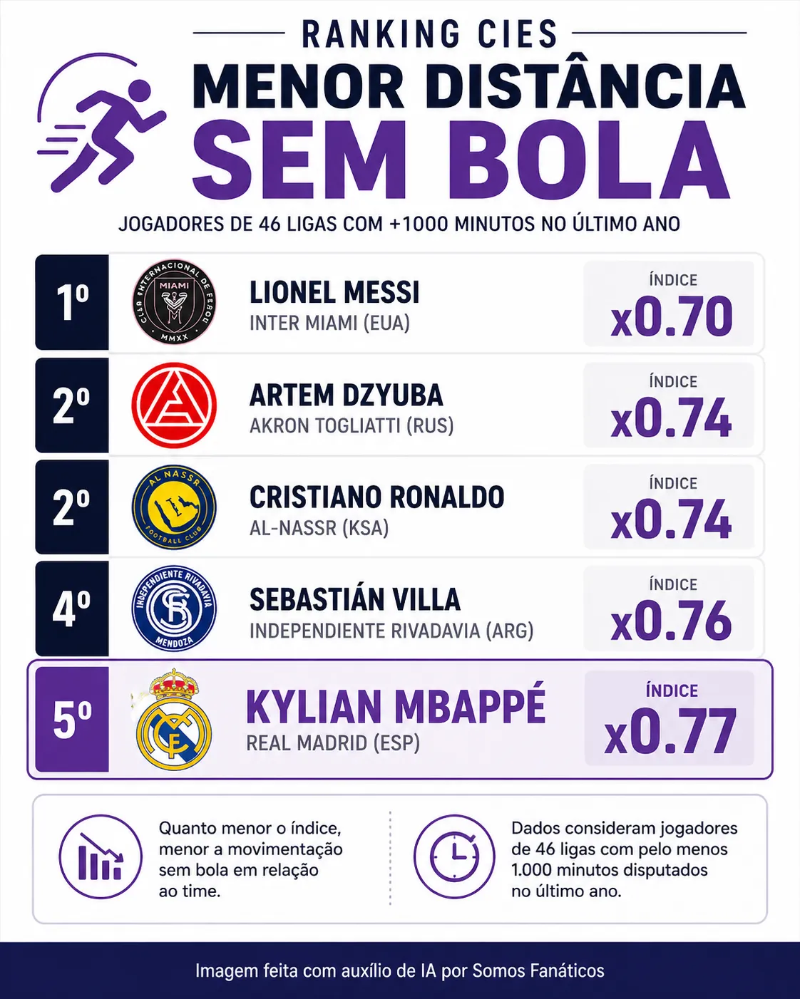 Kylian Mbappé aparece na quinta posição de um ranking que mede a distância percorrida sem bola em relação aos companheiros do Real Madrid. O dado foi publicado pelo jornal espanhol Mundo Deportivo a partir de um estudo do Centro Internacional de Estudos do Esporte (CIES).