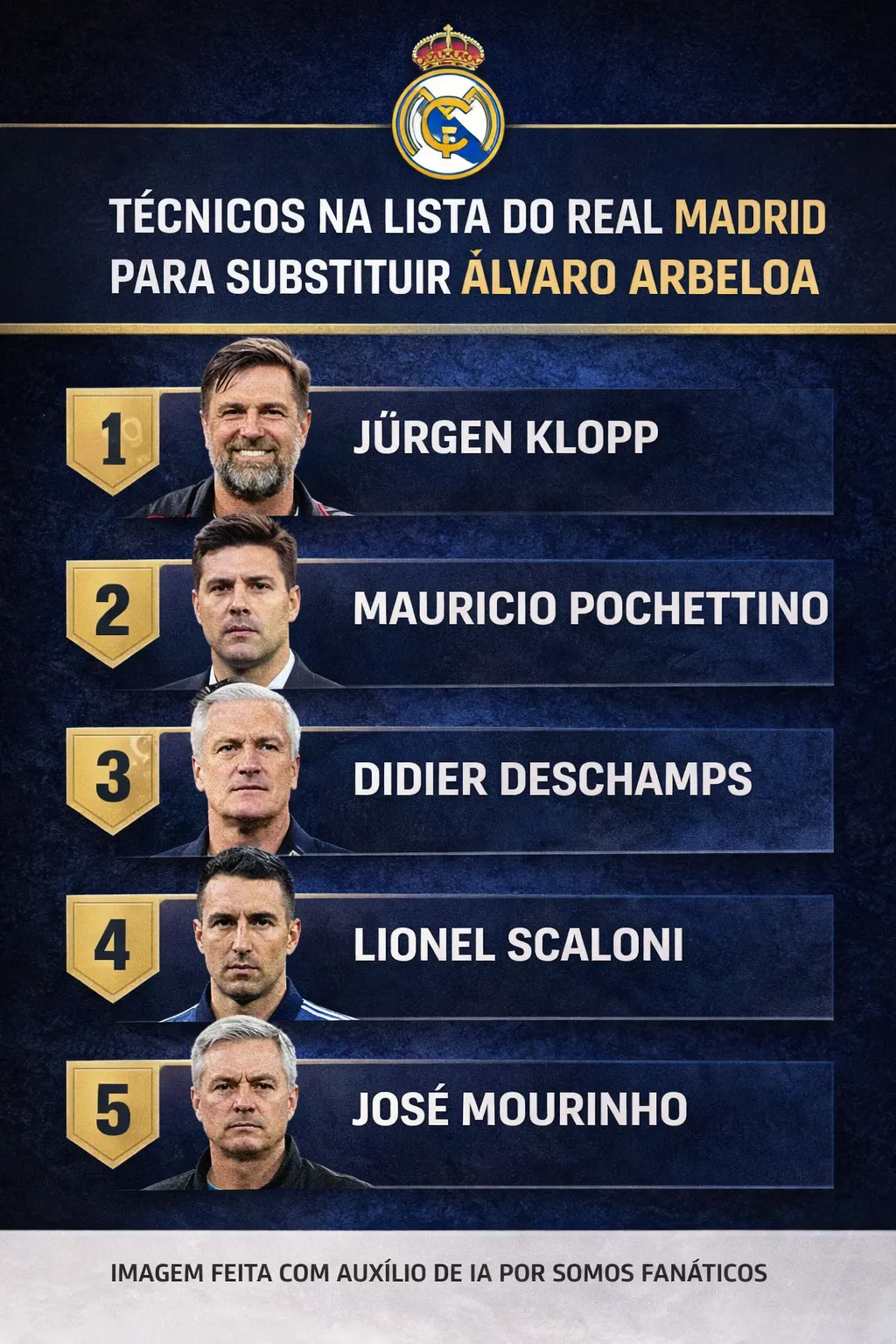 A permanência de Álvaro Arbeloa como técnico do Real Madrid não deverá acontecer e o clube já busca no mercado um substituto. De acordo com o jornal espanhol El Mundo, cinco nomes já estão na lista do presidente Florentino Pérez.