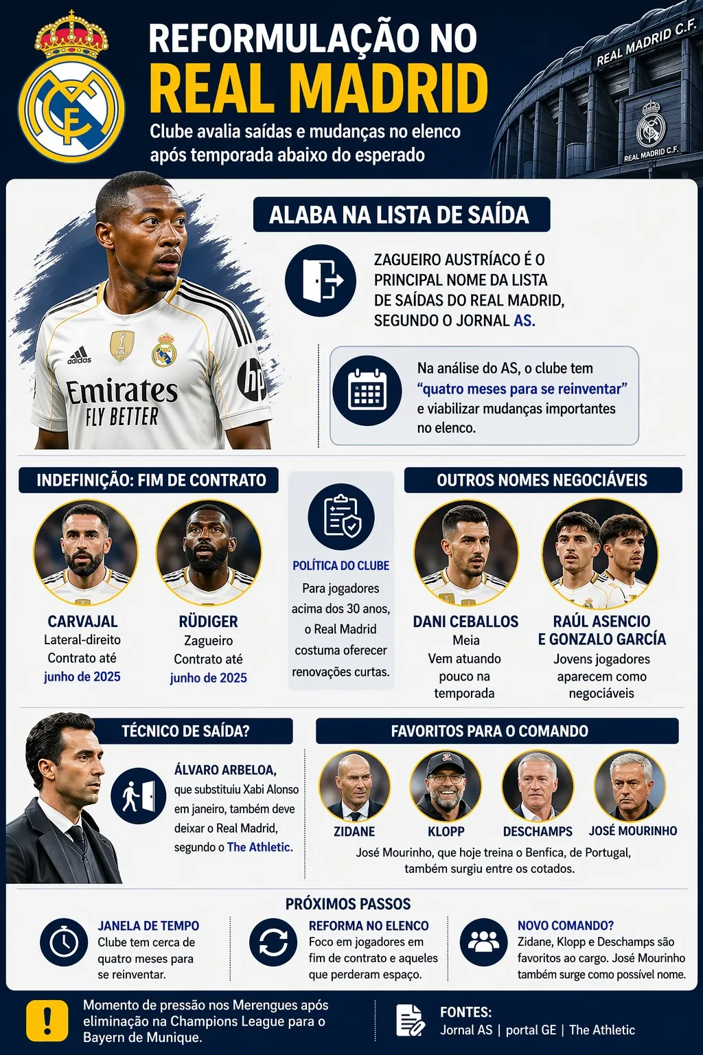 O Real Madrid avalia saídas e uma reformulação em seu elenco, com o zagueiro David Alaba como principal nome dessa lista, que tem sua saída praticamente definida, segundo o jornal espanhol AS.