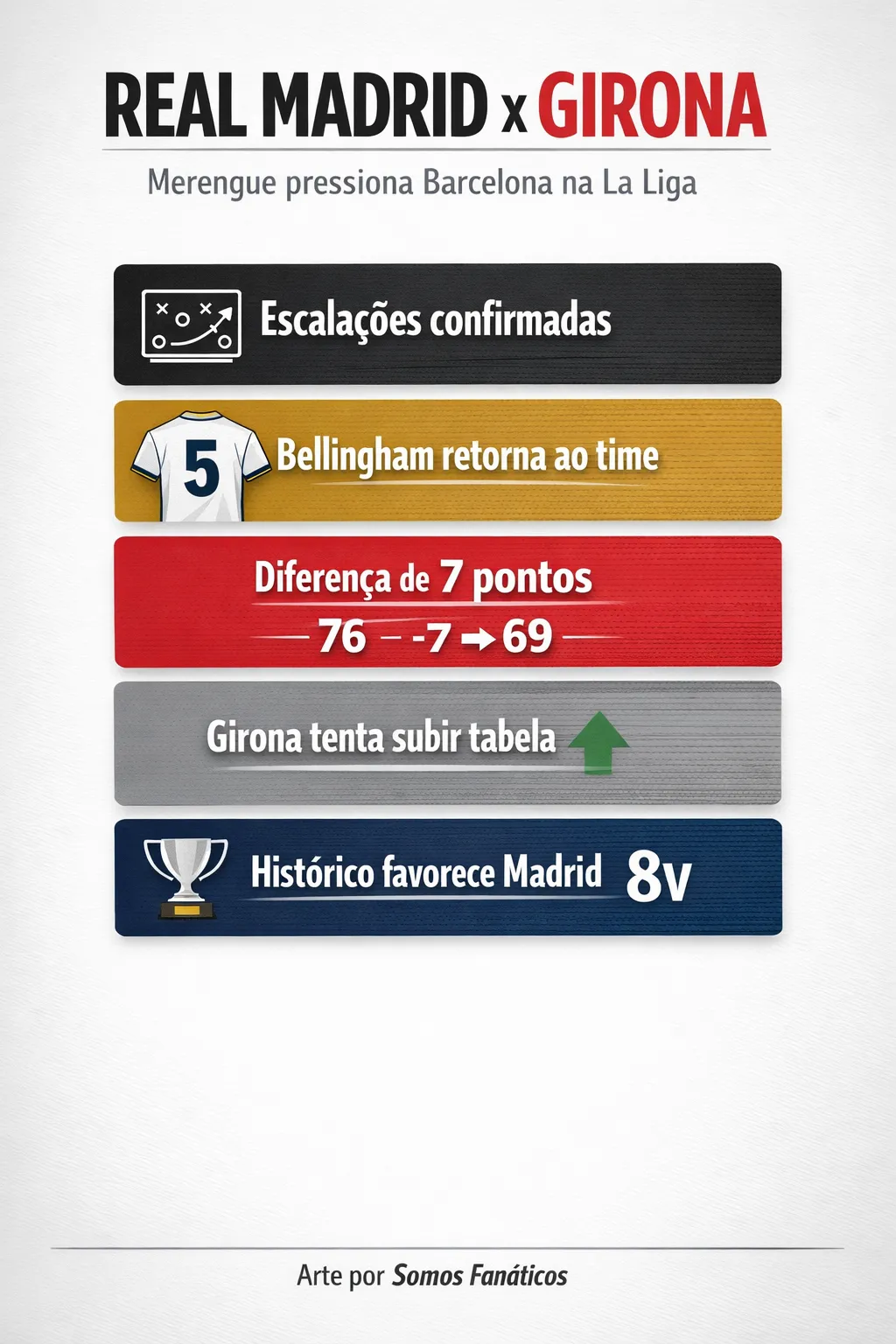 Na tabela de classificação, o time merengue é o segundo colocado com 69 pontos e busca colar ainda mais no líder, o rival Barcelona, que possui 76 pontos conquistados até aqui. Já o Girona, é o 12º colocado com 37 pontos.
