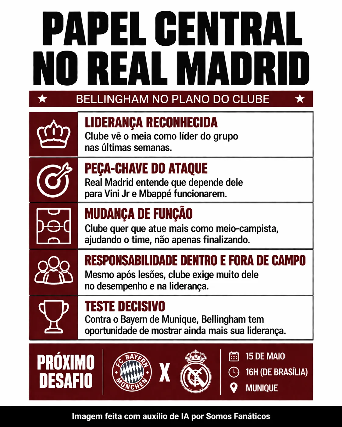 Bellingham recebeu uma mensagem interna do Real Madrid para a partida decisiva contra o Bayern de Munique, pela Champions. O clube entende que depende do meio-campista para que as outras estrelas do ataque funcionem – principalmente Vini Jr e Mbappé.