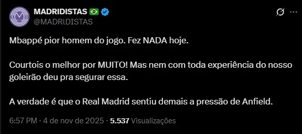 Os únicos com um desempenho minimente positivo na partida desta terça foram Valverde e Courtois, que tentaram impedir que uma goleada histórica ocorresse. Ao contrário deles, Vini Jr, Mbappé, Bellingham e Arda Guler foram considerados por muitos como os piores em campo.