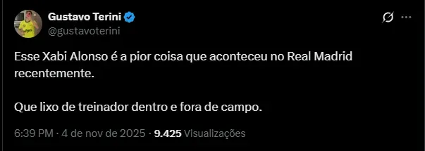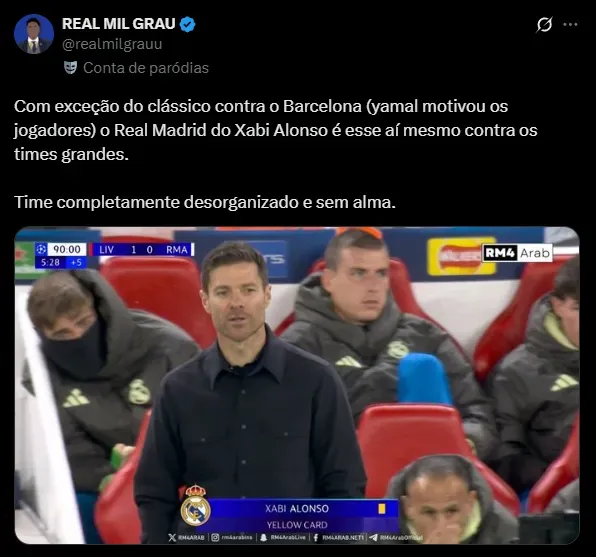 O técnico Xabi Alonso se tornou um dos principais alvos de críticas nas redes sociais após a derrota do Real Madrid para o Liverpool. Os Fanáticos acreditam que o comandante não possui nível para estar à frente do time, que não vem fazendo uma boa temporada.