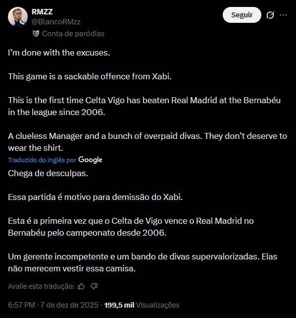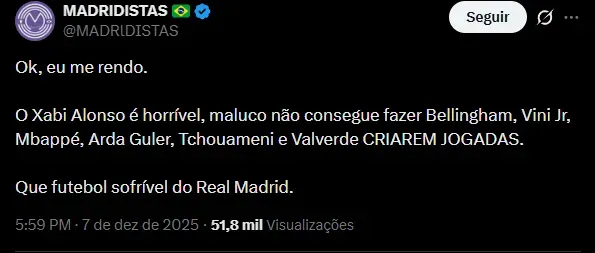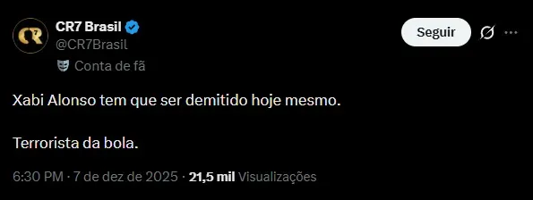 Nas redes sociais, Xabi Alonso foi duramente criticado pelos torcedores do Real Madrid após a derrota do clube para o Celta de Vigo. Os Fanáticos contestaram algumas escolhas do comandante durante a partida.