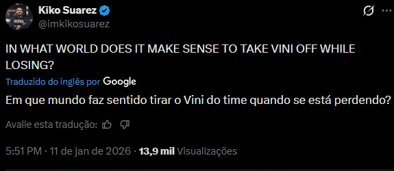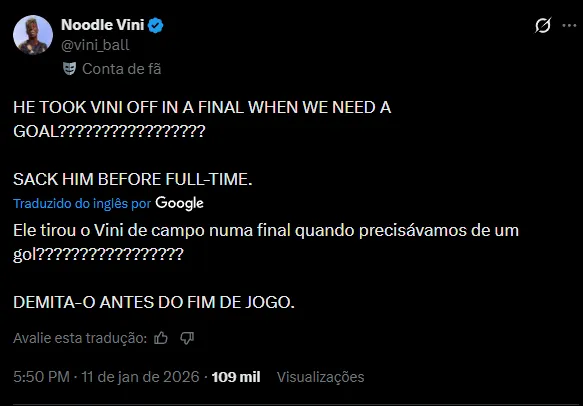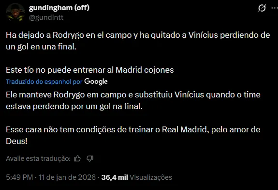 Dentre os principais pontos discutidos pelos Fanáticos está a substituição de Vini Jr, tido como muitos como o melhor jogador do time em campo. Ele abriu mão do brasileiro para utilizar Mastantuono, que está retornando recentemente de lesão.